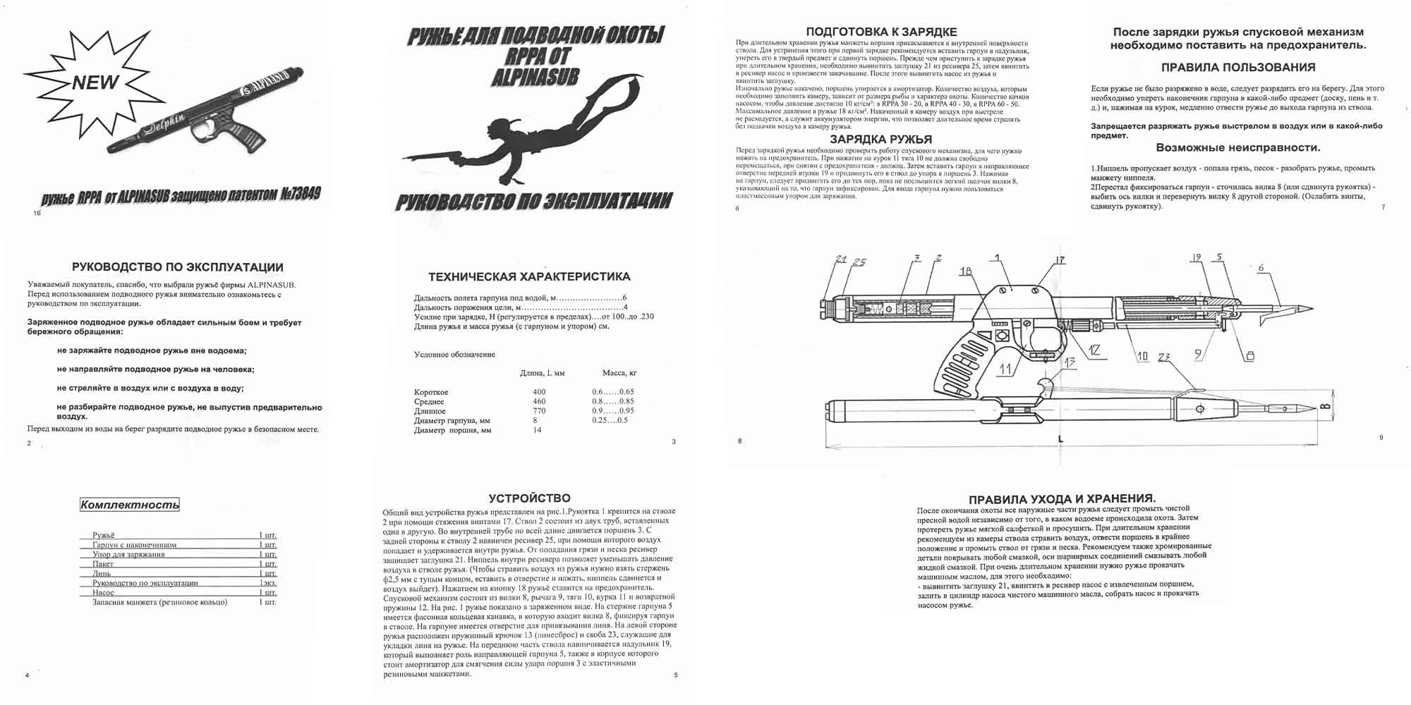 в комплекте - гарпун с наконечником; упор для заряжания; линь; насос; запасная манжета (резиновое кольцо); руководство по эксплуатации
