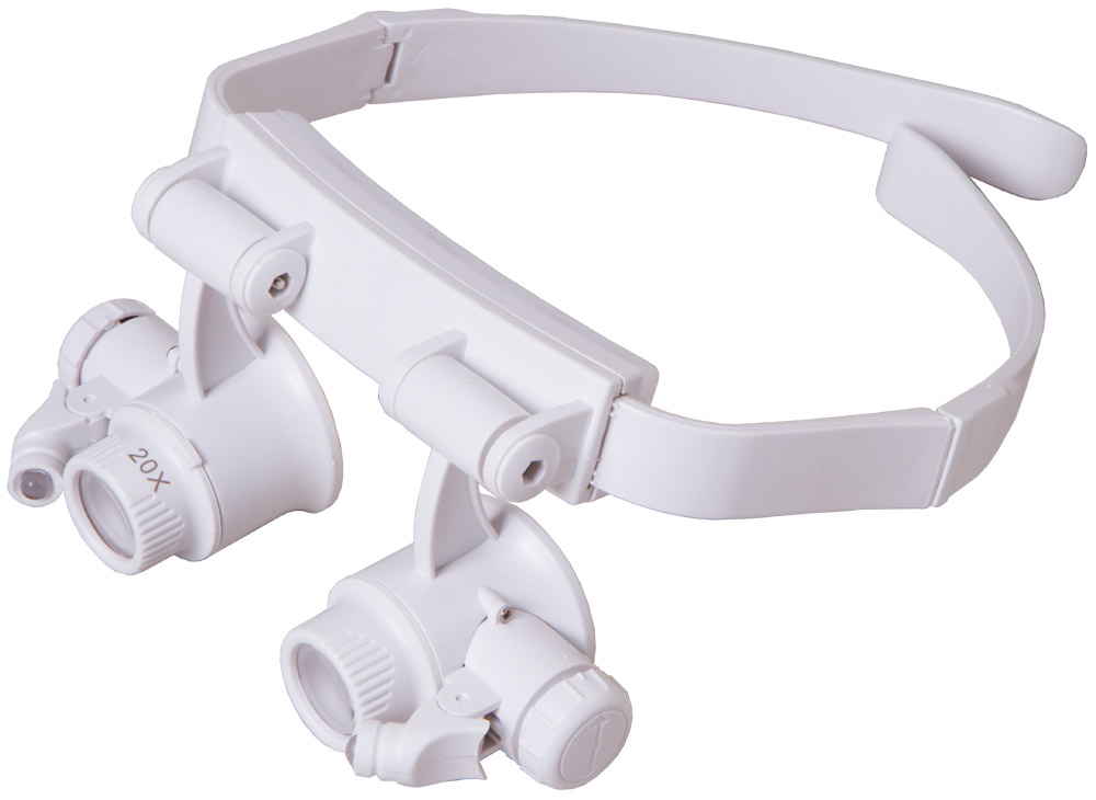 Лупа-очки Levenhuk Zeno Vizor G6 – это бинокулярная налобная лупа с четырьмя комплектами парных сменных линз. Диапазон увеличений составляет от 10 до 25 крат с шагом в 5 крат. Каждый окуляр снабжен небольшим и ярким светодиодом – это удобно при работе в полной темноте или при слабой освещенности. Подсветка работает от батареек, если она не нужна, ее можно выключить. Угол наклона подсветки регулируемый.