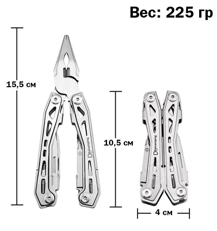 Daicamping DL3 оборудован всеми необходимыми инструментами для походов, кемпингов и активного отдыха на природе. Мультитул имеет презентабельный внешний вид: стальные металлические рукоятки характерной крестообразной формы удобно лежат в руках при использовании любого инструмента.