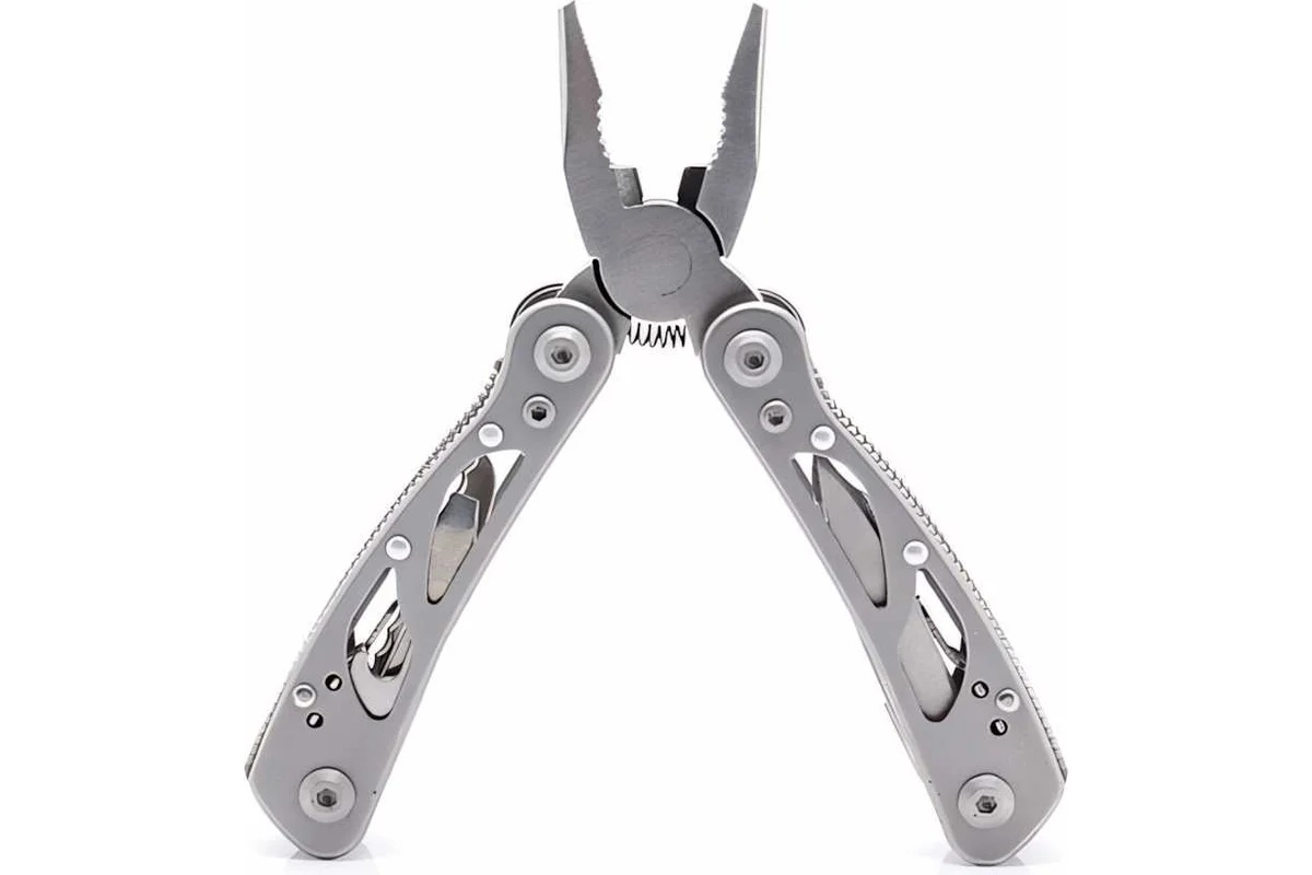 Функции: плоскогубцы, кусачки, средняя отвертка плоская, маленькая отвертка плоская, крестообразная отвертка, нож, серрейтор, открывалка для бутылок, для снятия изоляции, шило, пилочка для ногтей